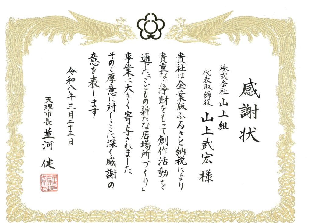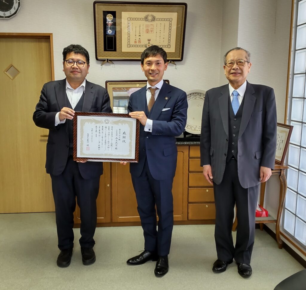 3月23日に天理市長にご来社いただき、本取り組みに対する感謝のお言葉とともに、感謝状をいただきました。
